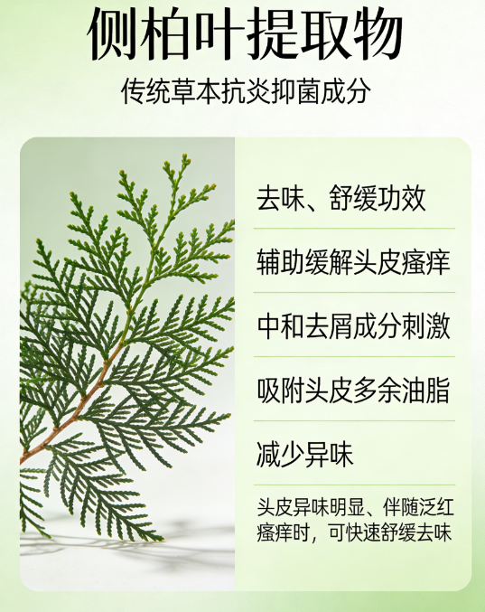 吡罗克酮乙醇胺盐还能调节头皮角质形成细胞的增殖周期,减少角质层异常增厚与脱落,避免大块头屑产生,同时抑制促炎因子释放,缓解头皮瘙痒,实现“去屑+止痒”双重效果。搭配侧柏叶提取物,这一传统草本成分兼具抗炎、抑菌功效,与吡罗克酮乙醇胺盐协同作用,形成“科学去屑+草本舒缓”的双重保障,彻底解决头屑反复、越洗越痒的难题,实测使用28天,头屑减少率达89%,头皮瘙痒缓解率达92%。